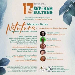 185Terus Bertumbuh, Merawat Solidaritas, Menegakkan Hak Asasi ManusiaSalah satu rangkaian acara perayaraan 17 Tahun SKP-HAM Sulteng adalah “Notutura: Meretas Batas, Memaknai Tuturan Para Penyintas”.Ini adalah sebuah upaya untuk memahami, menggali, dan sekaligus belajar dari pengalaman dan perjuangan para korban, yang pernah mengalami pelanggaran HAM, ketidakadilan, kekerasan, dan penderitaan, hingga pada akhirnya mereka sanggup menjadi para penyintas yang berdiri tegak untuk terus memperjuangkan hak-haknya.Para penyintas yang hadir kali ini adalah dari lintas peristiwa dan lintas generasi.Dari tuturan para penyintas harapannya kita akan tetap bisa merawat ingatan dan sekaligus memberi penguatan bahwa peristiwa-peristiwa serupa yang mereka alami tidak akan pernah terjadi lagi di masa-masa mendatang: naganamo!